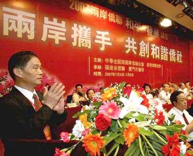 图:“2007两岸侨联和平与发展论坛”7月4日在厦门举行,中国侨联主席林兆枢在会上讲话 |